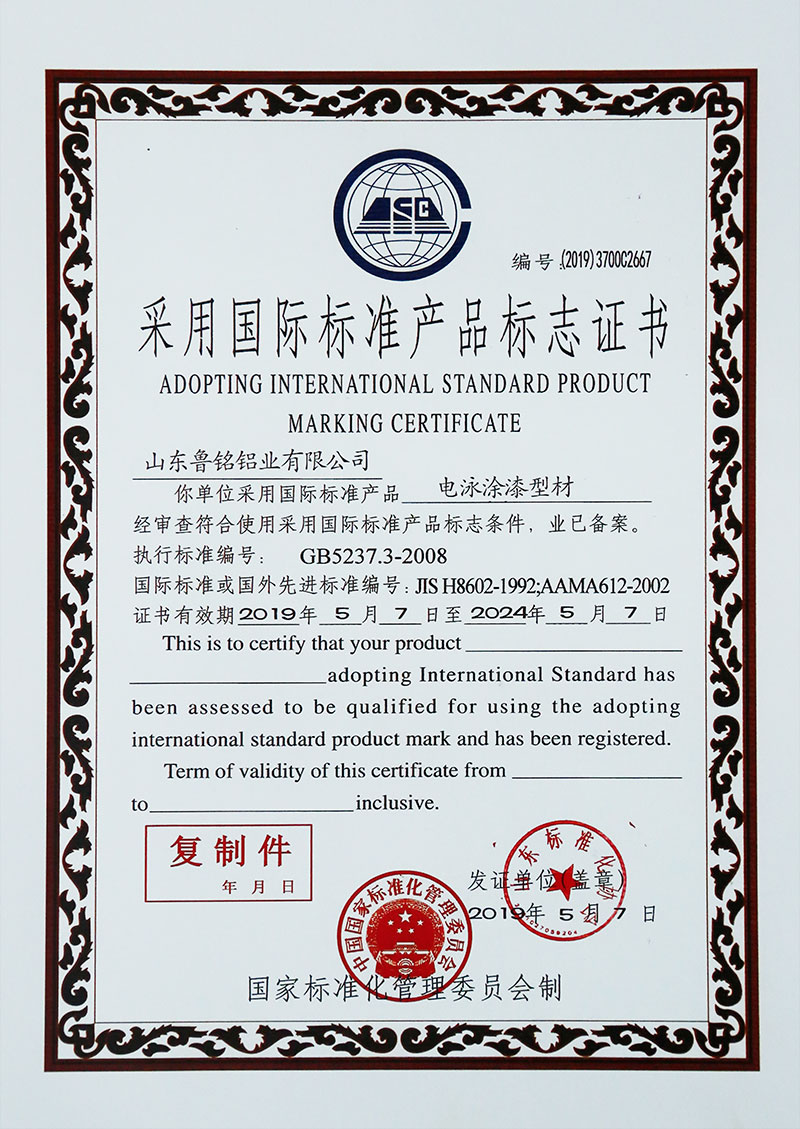 采用國(guó)際標(biāo)準(zhǔn)產(chǎn)品標(biāo)志證書(shū)