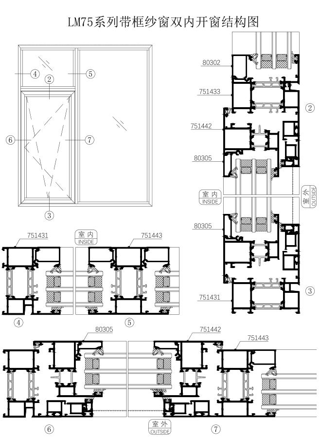 LM75系列帶框紗窗雙內(nèi)開窗結(jié)構(gòu)圖